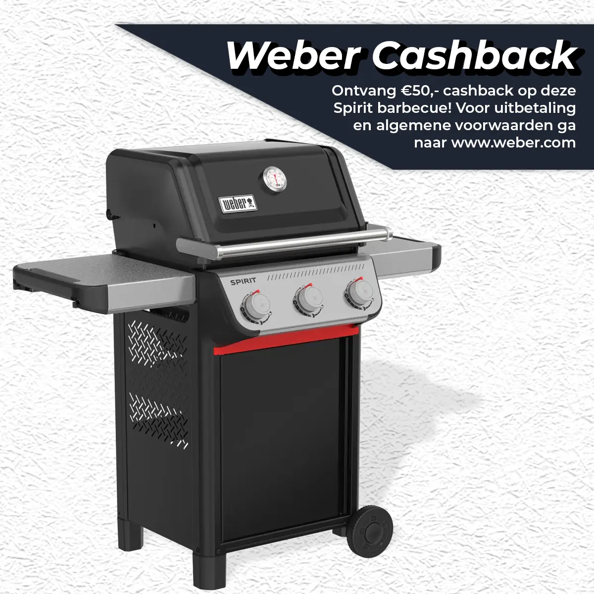 Bij aankoop van deze barbecue kun je €50,00 cashback ontvangen. Hiervoor moet je de barbecue ten laatste op 17/5/2026 aankopen en registreren op WEBER.com. Registreer de barbecue op Weber vóór 31/05/2026. Voor het registreren heeft u het unieke serienummer nodig dat op de verpakking staat en het factuur dat u van ons ontvangt. Na goedkeuring van de registratie bij Weber ontvang je vanuit hen de terugbetaling.